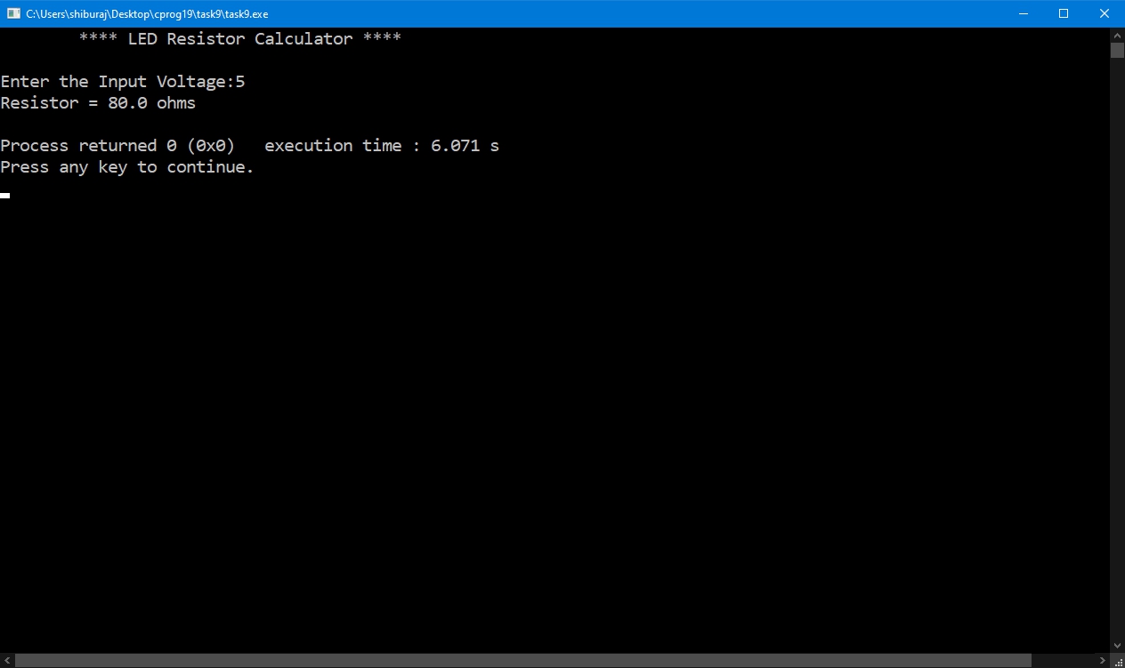 WAP to calculate the resistance required (R) to be connected in series with the LED to protect it from blowing up when Voltage (V) is applied.
