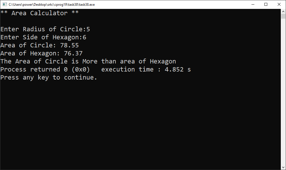 WAP to find area of a circle and a hexagon and also find which shape has a larger area using functions.